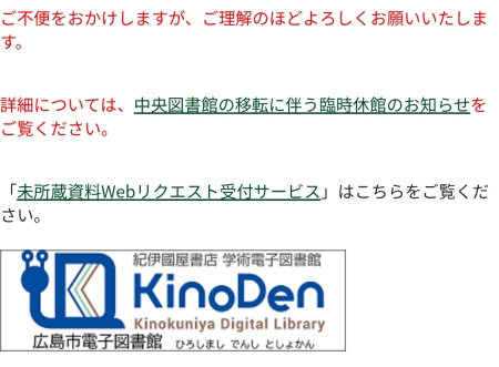 ちょうど今、広島市立中央図書館は基町から広島駅前の「エールエールA館」への移転準備が進んでいます。中央図書館の蔵書は移転中は借りられないので、本好きの私としては、本を借りたいのに借りられないというのがとても残念でした。